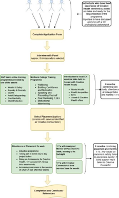 In Figure ii I have adapted the scheme to translate to the creative health landscape in Doncaster, and to work with the ‘Creative Connection’ model envisioned by the Creative Connector to offer placements for Ambassadors. The scheme would be managed by the Creative Connector and could potentially:
